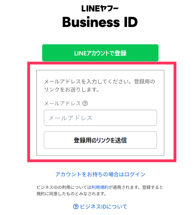 遷移先ページの「メールアドレスで登録」をクリックし、メールアドレスを入力して「登録用のリンクを送信」をクリックします。LINEビジネスID登録用のメールが届いた後、必要な情報を入力して完了です。