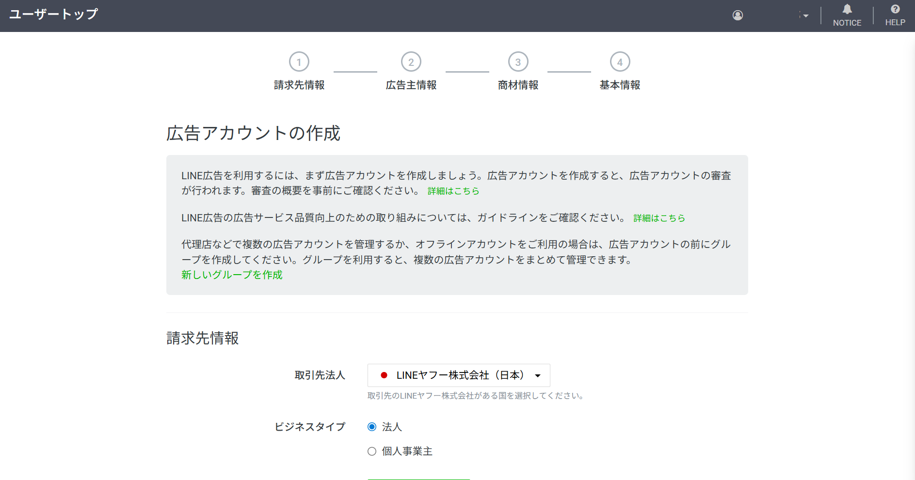 LINEビジネスID登録後に、先ほどのLINE広告申し込みページの「今すぐはじめる」ボタンをクリックすると、広告アカウント作成ページに遷移します。