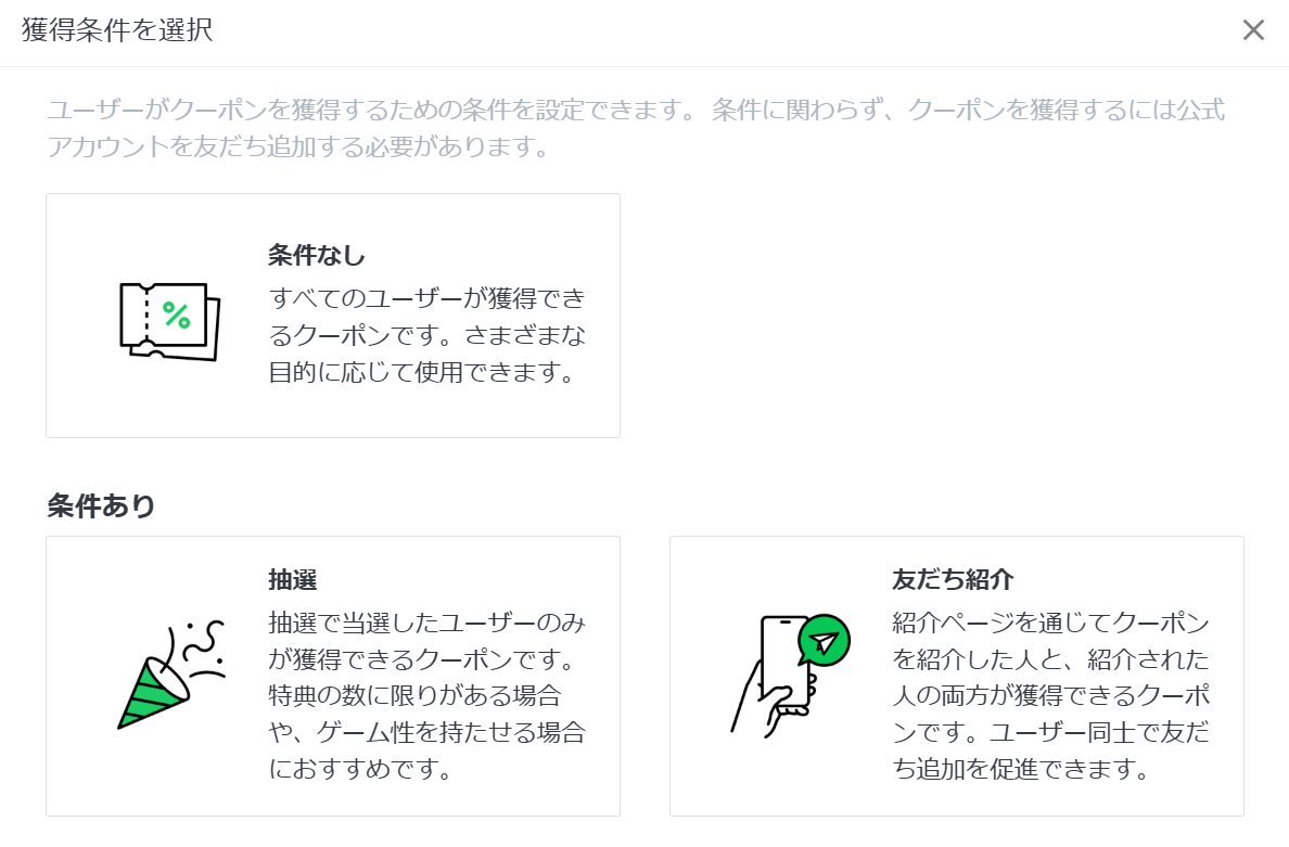 LINE公式アカウントのクーポンには、大きく分けて3つのタイプがあります。もっとも一般的な「条件なし」クーポンは、友だち全員が取得できる標準的なクーポンです。新規友だち追加時の特典や、定期的な販促キャンペーンに適しています。