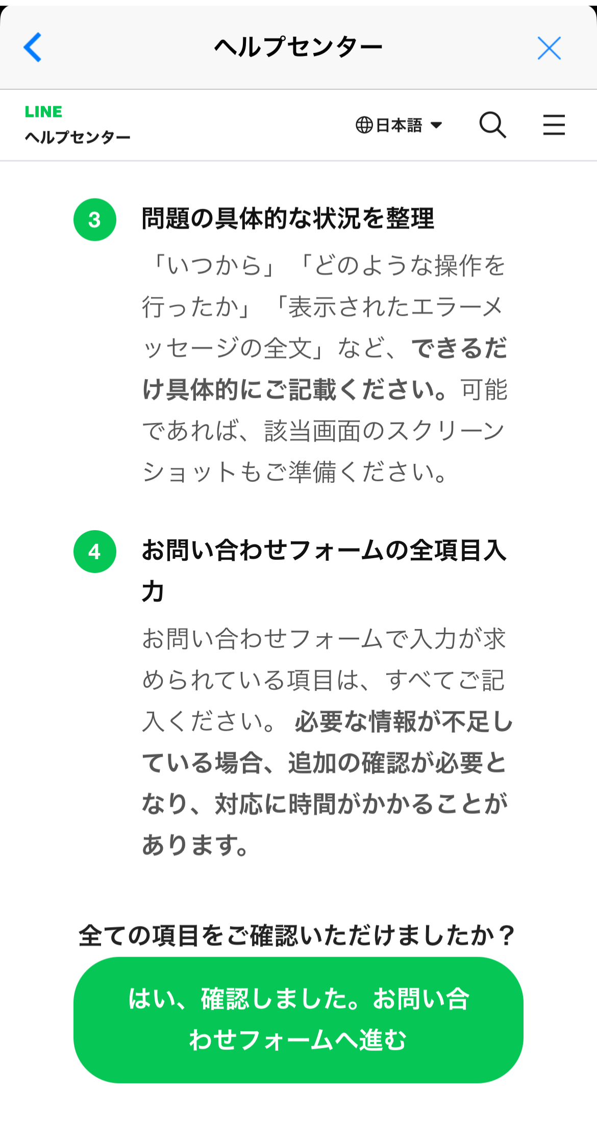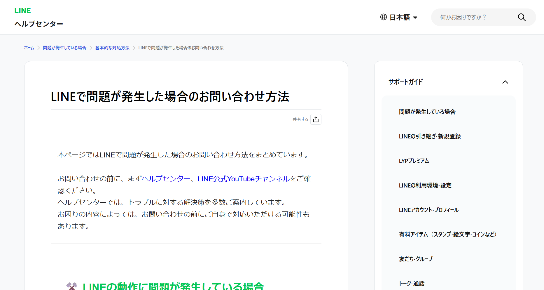 STEP①:LINEヘルプセンターの「LINEで問題が発生した場合のお問い合わせ方法」にアクセス