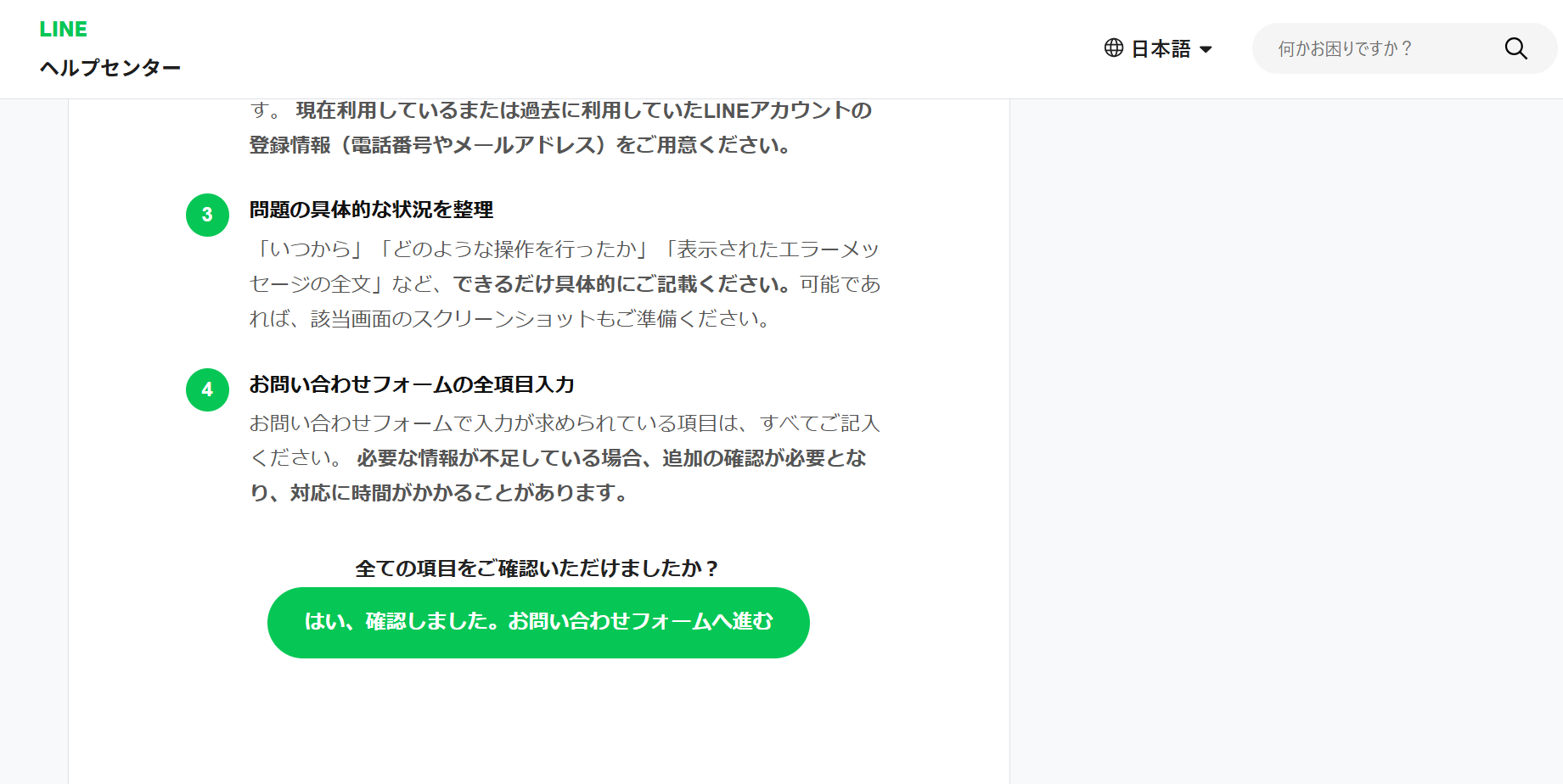 LINEカスタマーサポートには、お問い合わせフォームから連絡できるとお伝えしましたが、実際に問い合わせるために確認したいことが2つあります。