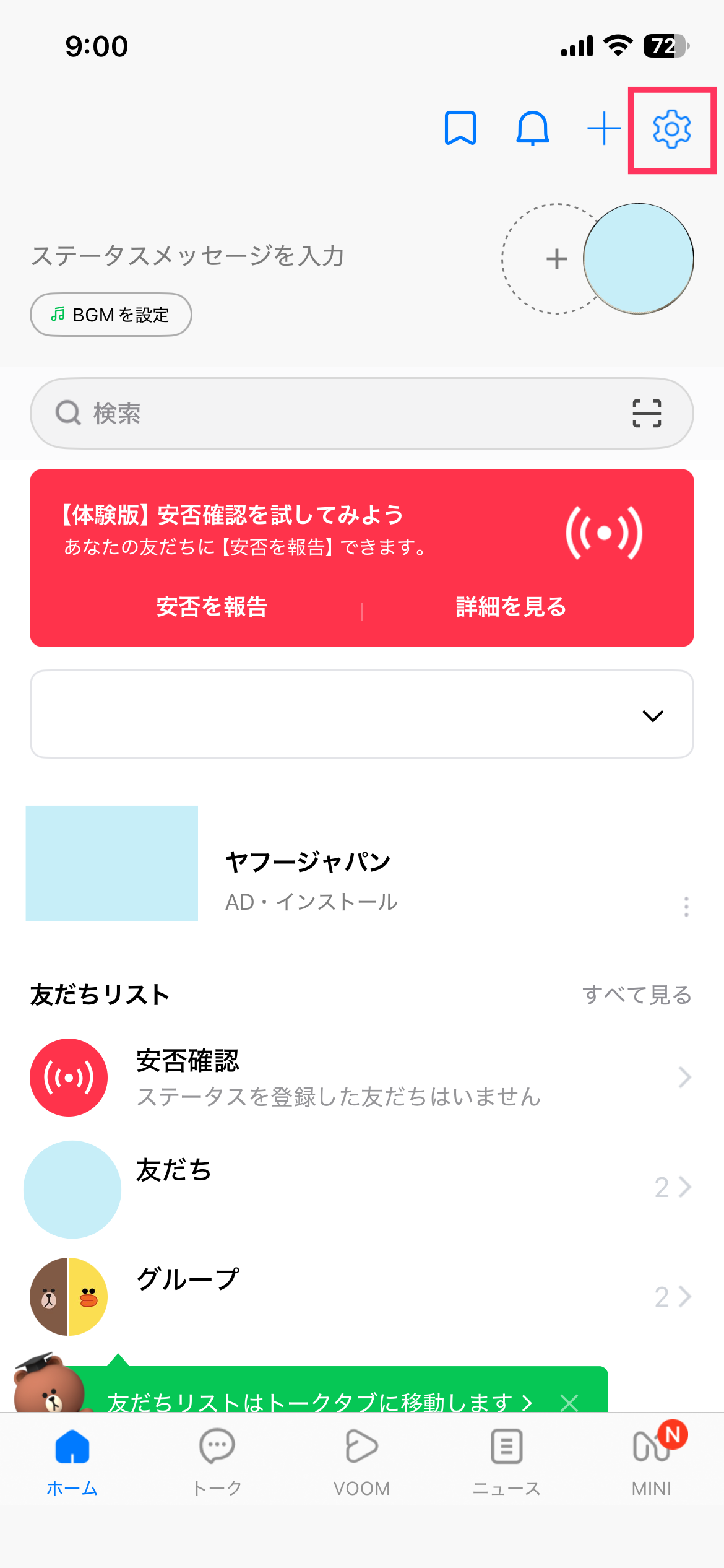 STEP①:ホーム画面右上にある歯車マークをタップ