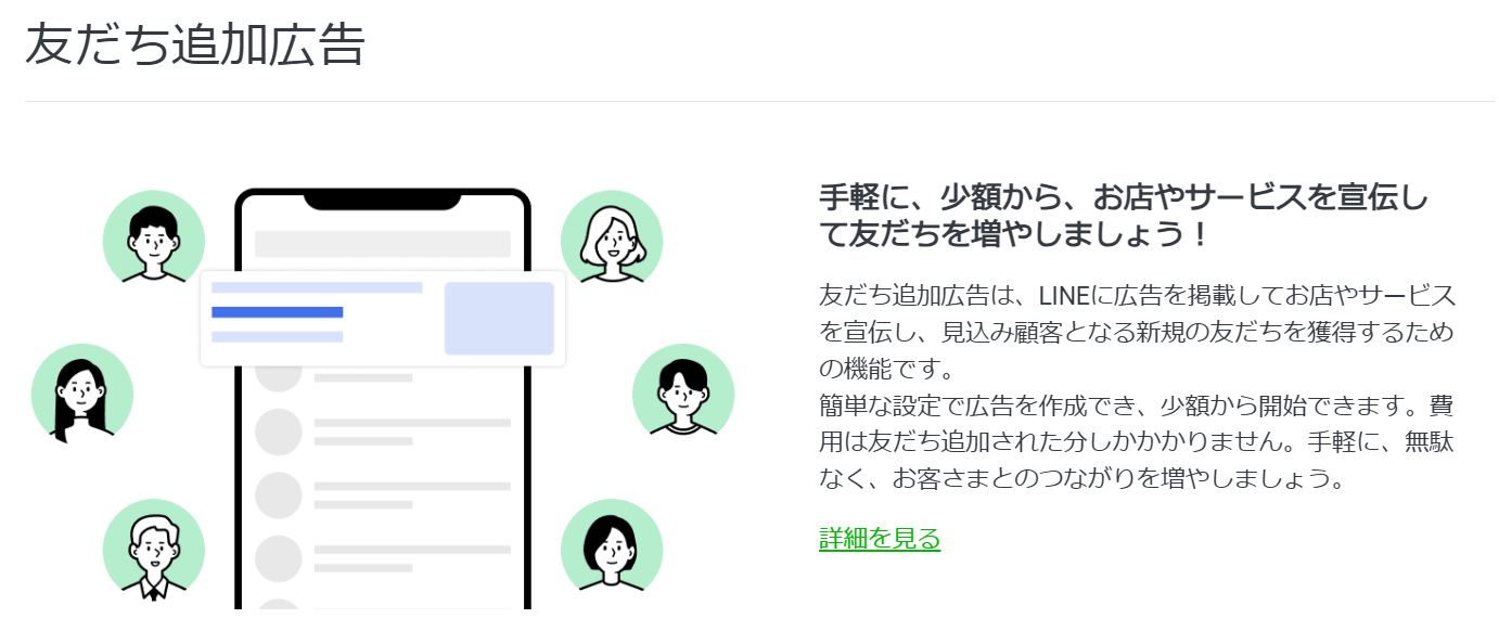 LINE広告は、LINEアプリ内に広告を配信できるサービスです。LINE公式アカウントと連携することで、効率的な友だち獲得が可能になります。最低出稿額の制限がなく、小規模事業者でも始めやすいのが特徴です。