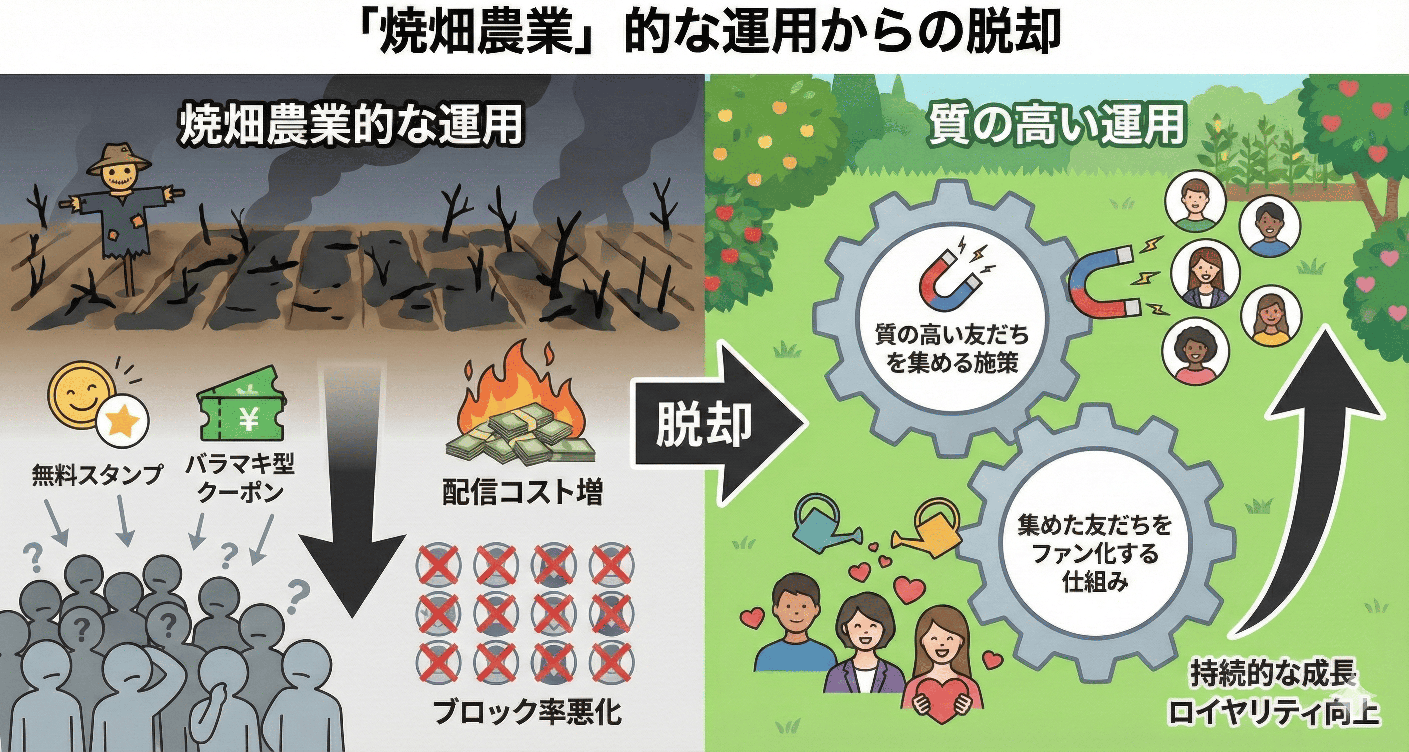 その結果、配信コストだけが膨らみ、ブロック率が悪化するという悪循環に陥ります。重要なのは、「質の高い友だちを集める施策」と「集めた友だちをファン化する仕組み」の両輪を回すことです。