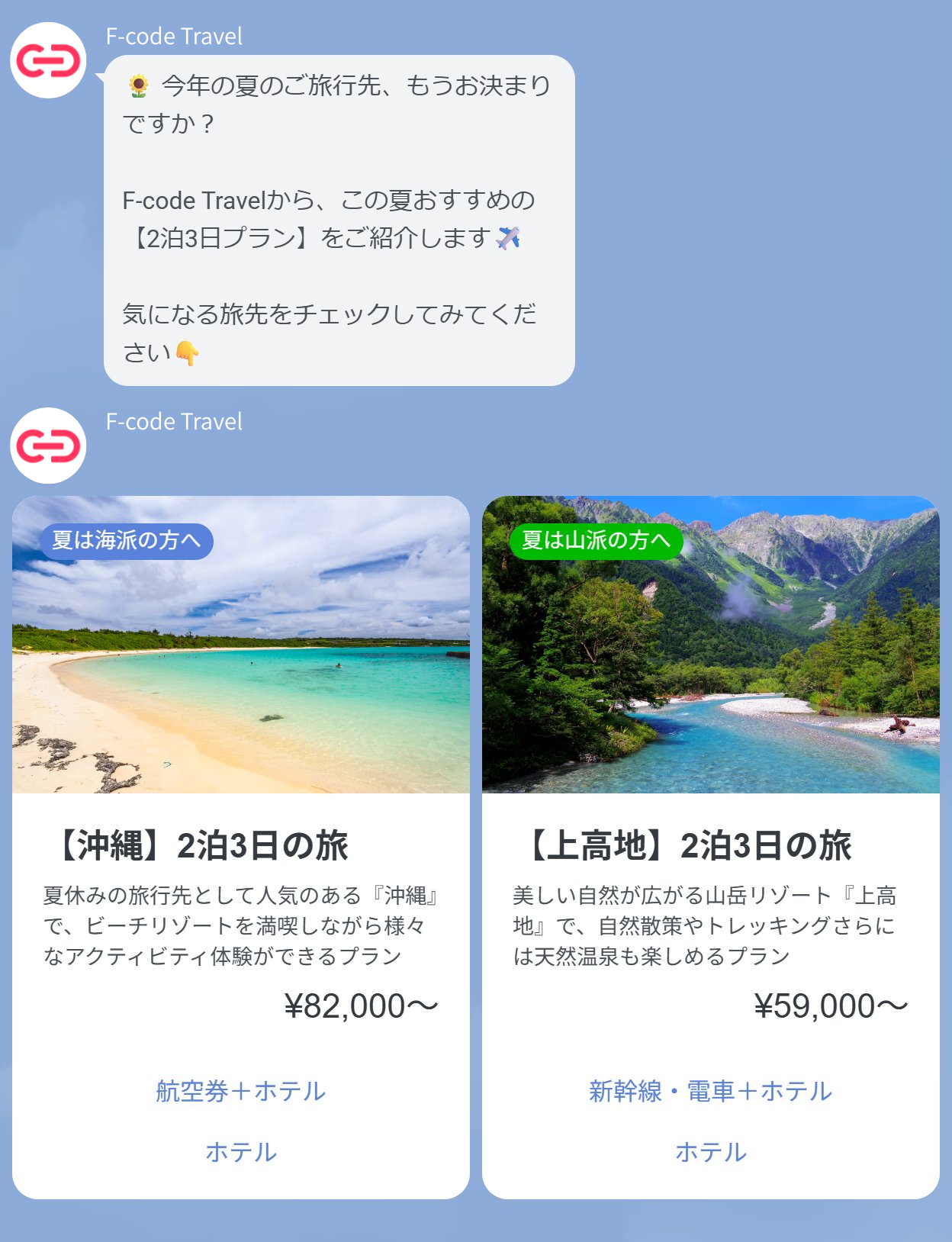 カードタイプメッセージカルーセル形式で複数のコンテンツを1つにまとめて送信できる