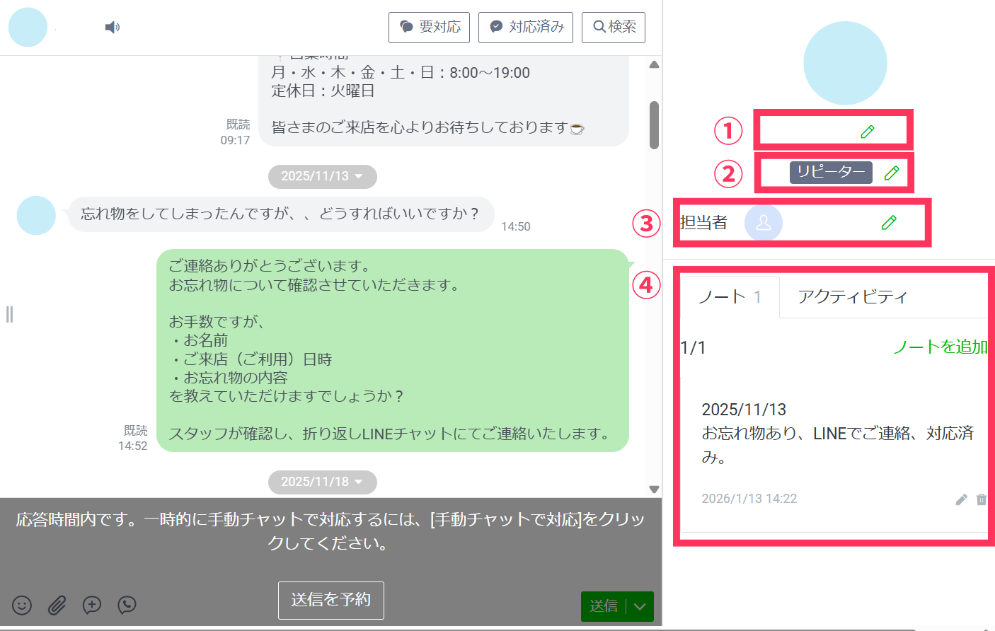 ④ノート・顧客の特徴や対応履歴などを記録してメモのように使える