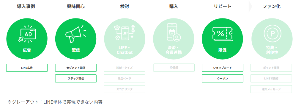 また、LINEは単なるメッセージングアプリではなく、決済機能やクーポン機能など、ビジネスに直結する機能を備えています。これらを活用することで、認知から購買まで一貫した顧客体験を提供できます。