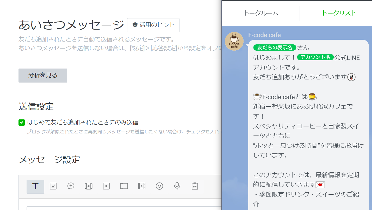 新しくフォローしたユーザーに自動で送信されるメッセージです。初めての接触時に好印象を与えることができます。
