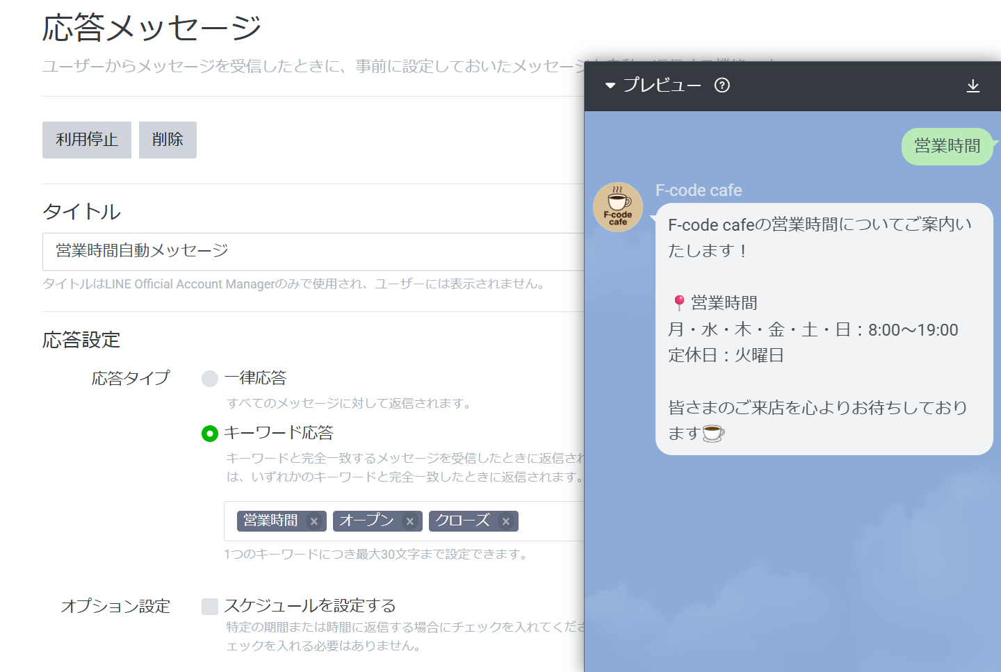 ユーザーからのメッセージに自動で返信する機能です。よくある質問への対応や、特定のキーワードに対する応答を設定できます。
