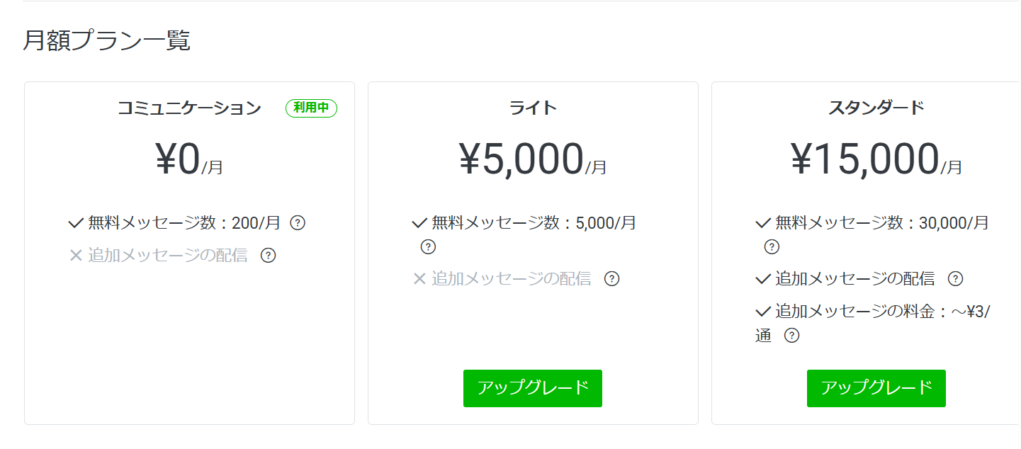 ステップ配信の料金は、LINE公式アカウントの3つの料金プランの無料メッセージ通数に含まれています。