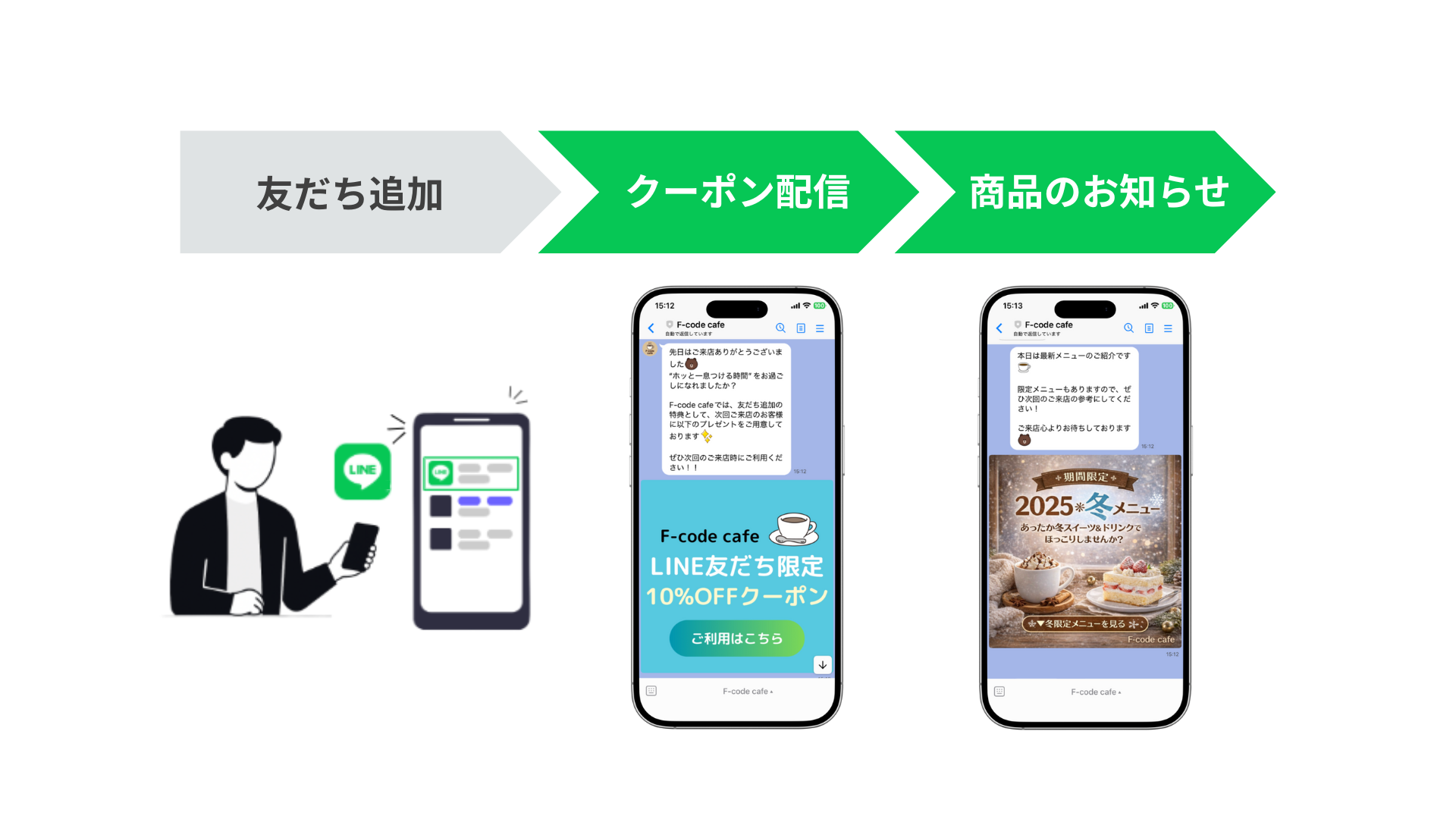 サービスや商品に興味を持って友だち追加したユーザーに、適切なタイミングで購入や来店を促せます。