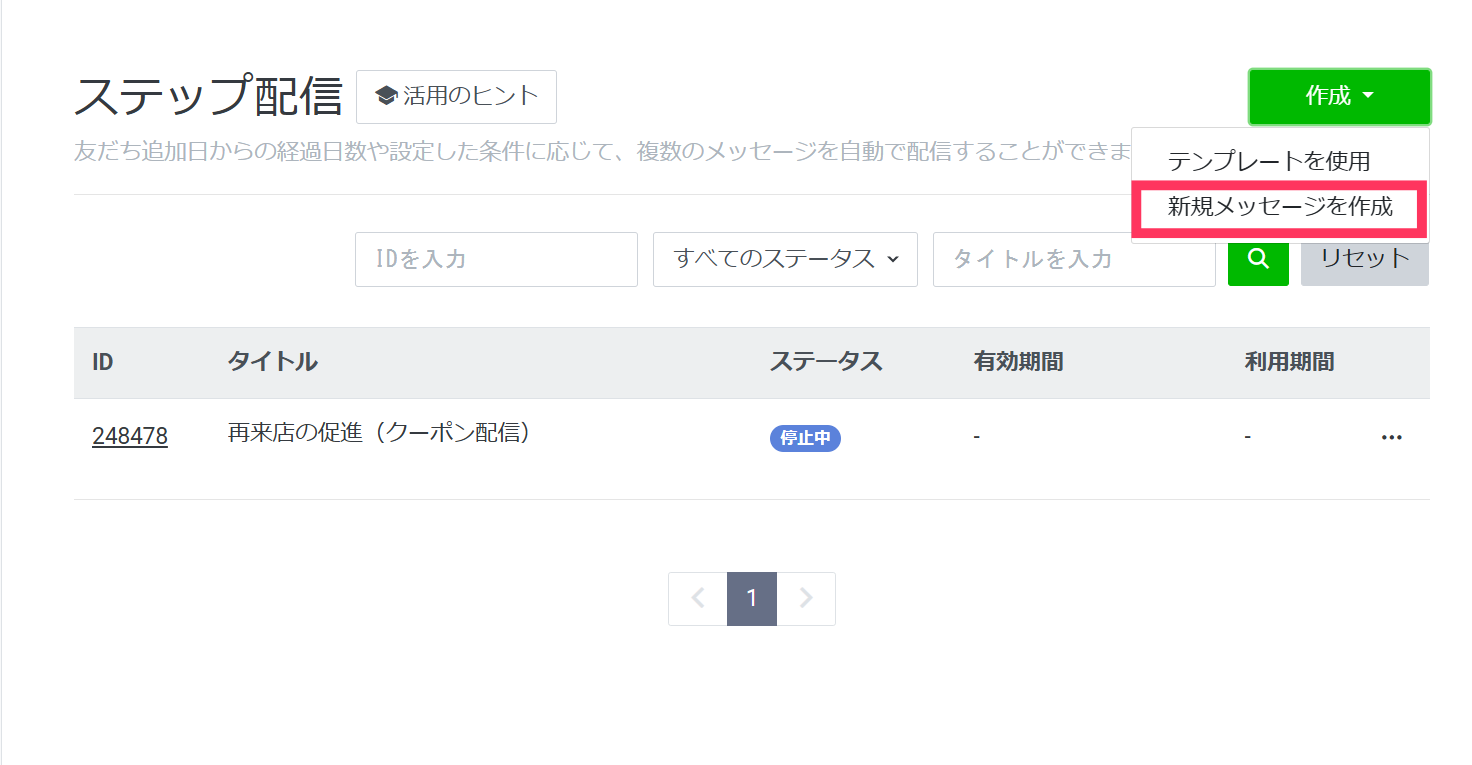 ①ステップ配信の設定画面にて、「作成」→「新規メッセージを作成」を選択します