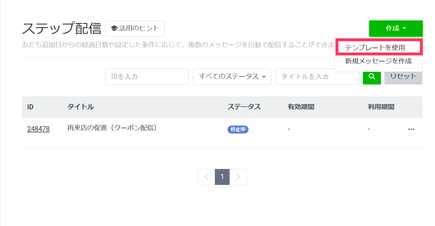 ①ステップ配信の設定画面にて、「作成」→「テンプレートを使用」を選択します