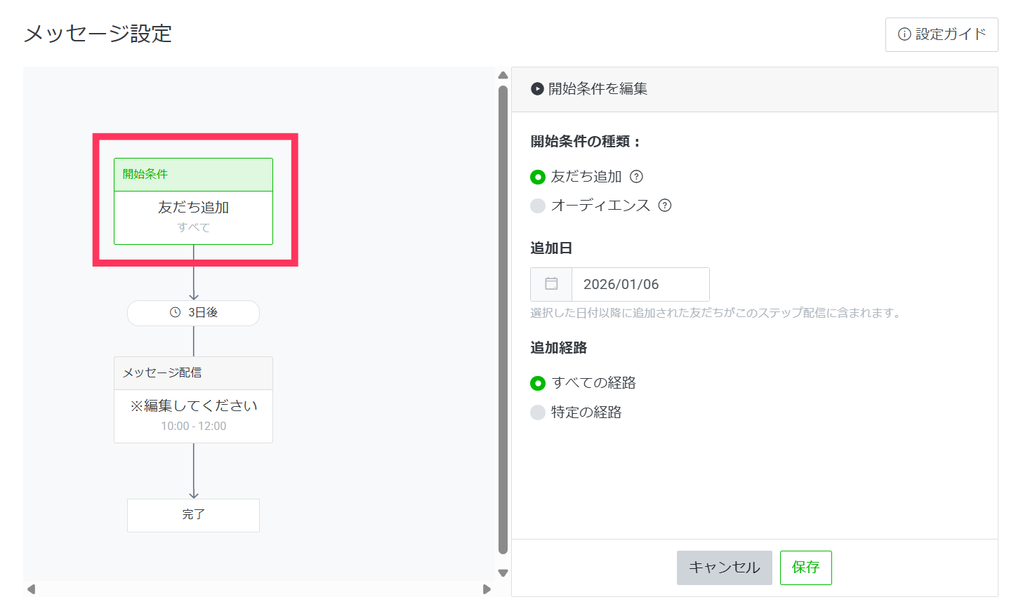 - 追加経路 「すべての経路」「特定の経路」 ※「友だち追加」選択時のみ