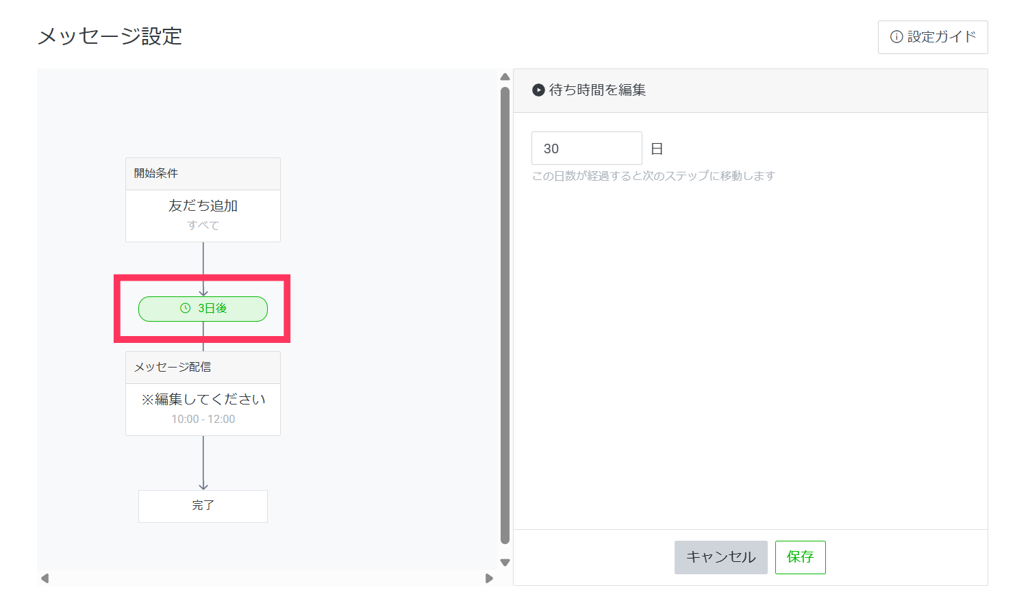 最大30日後まで設定可能です。設定した日数が経過すると、次のステップが開始されます。