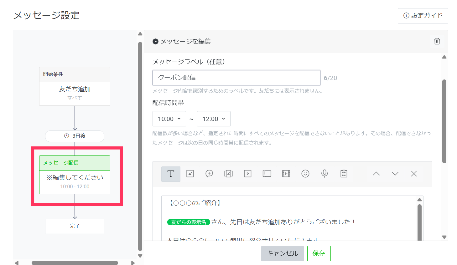 ステップ配信は、設定したタイミングでメッセージの自動配信が可能です。