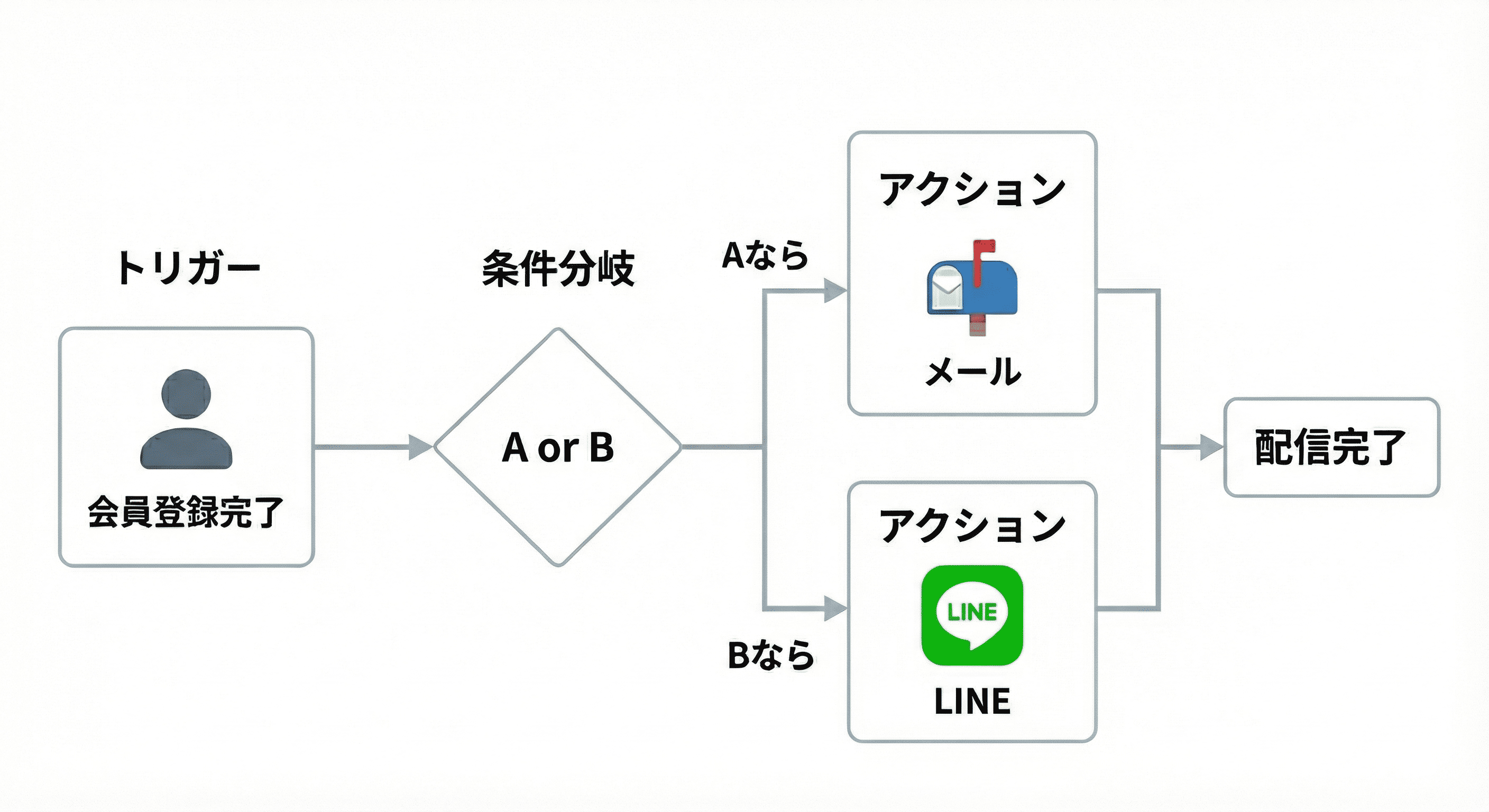 シナリオ配信は「トリガー」「条件分岐」「アクション」の3つの要素で構成される自動化された配信の仕組みです。