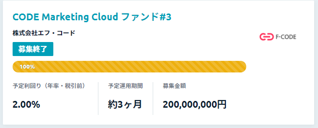 ・CODE Marketing Cloud ファンド#2…2022年11月16日に募集開始。即日満額申込。募集金額:2億円
