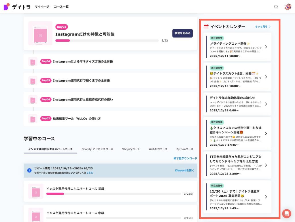 コミュニティツール(Discord)上のイベント情報をダッシュボードに集約し、学習とコミュニティ活動の相互送客を促進します。